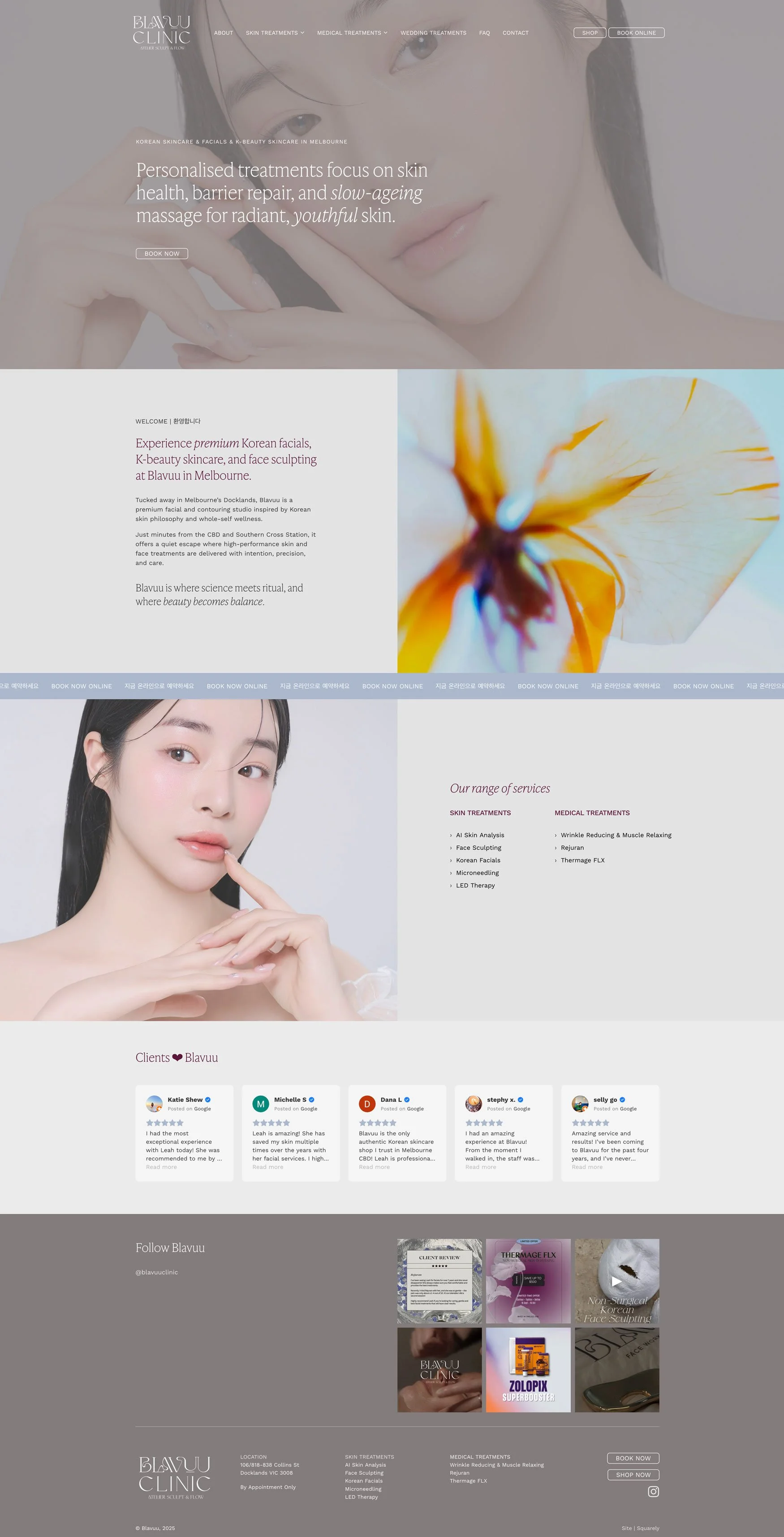 Blavuu stands as Melbourne's premier cosmetic clinic, specialising in Korean based skin treatments. A new website was developed to reflect the Blavuu brand and clinic aesthetics, allowing clients to also book online.